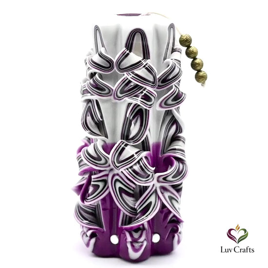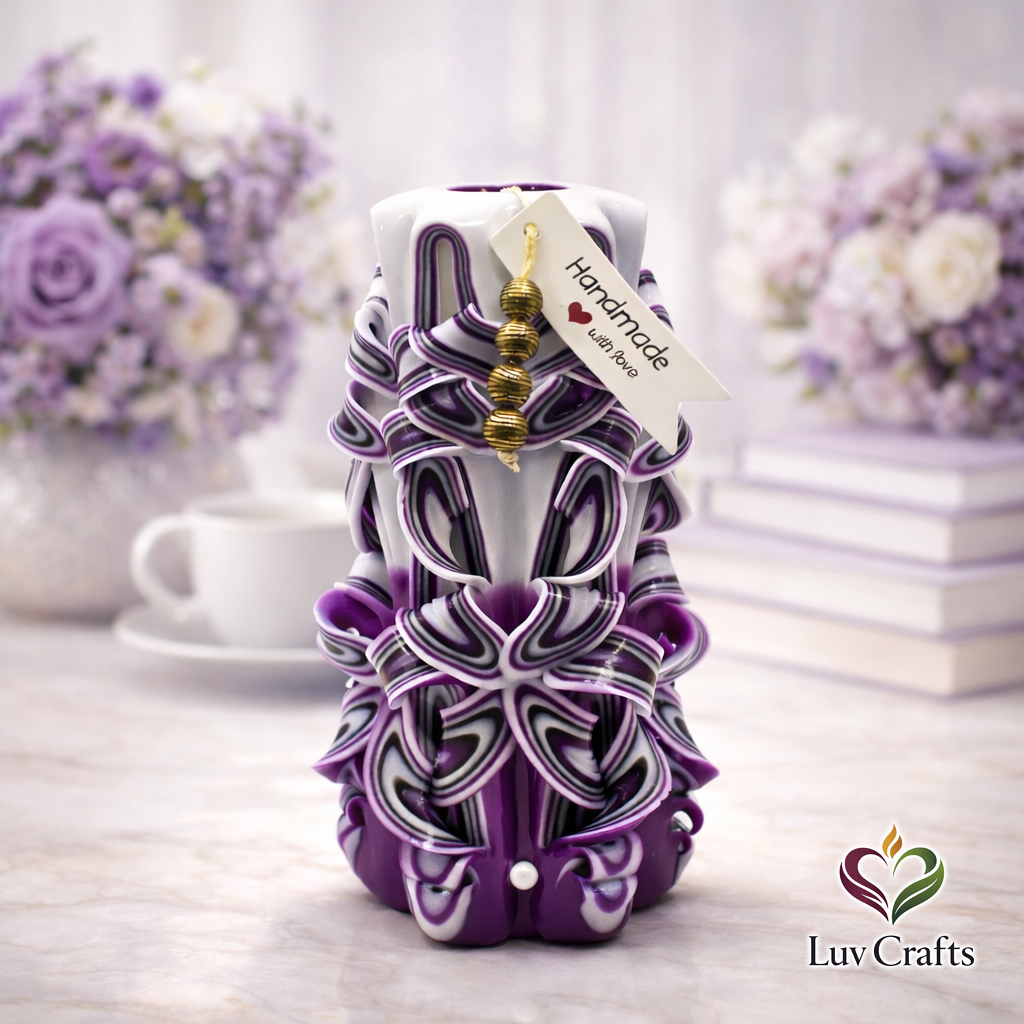Velvet Amethyst Ribbons – Hand-Carved Luxury Candle is a refined luxury purple candle designed as sculptural candle décor, where sculpted folds reveal intricate ribbon patterns with a gallery-like finish. Designed for collectors of refined wax art.